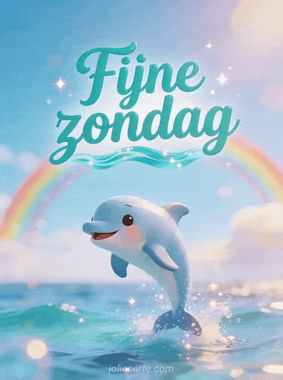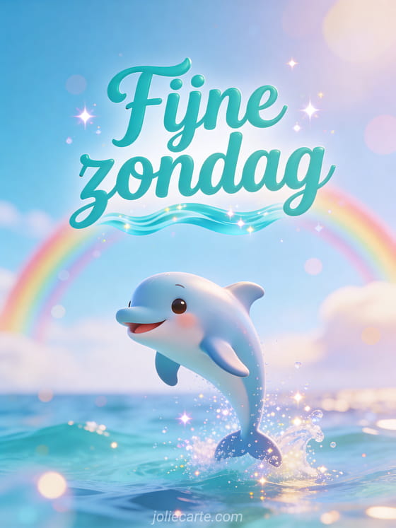 Deel een speelse zondaggroet met een schattige cartoondolfijn die uit sprankelend oceaanwater springt, een regenboog en heldere zomerenergie. Je kunt ook fijne zondagochtend of fijne zondag mijn liefste sturen.