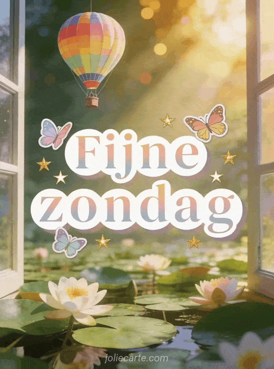 Stuur een poëtische fijne zondag kaart met ronde witte letters, kleurrijke vlinders, gouden sterren en een luchtballon boven bloeiende waterlelies. Ontdek ook hallo en fijne zondag, fijne zondag knus afbeelding of heel mooie fijne zondag afbeeldingen.
