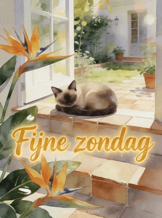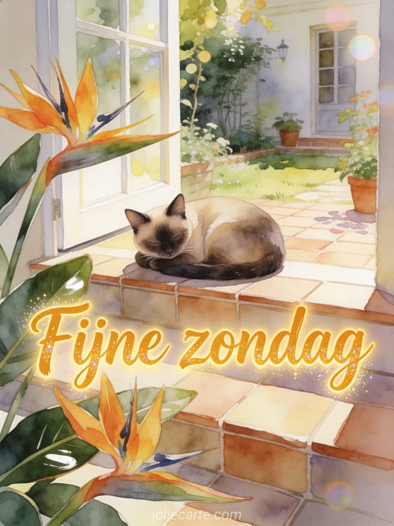 Deel een fijne zondag met een Siamese kat op een betegelde tuintrede, omringd door paradijsvogelbloemen en warm aquarellicht. Stuur dit tedere gebaar en ontdek ook gratis fijne zondag kaart, fijne zondag afbeeldingen of fijne zondag geanimeerde afbeelding.