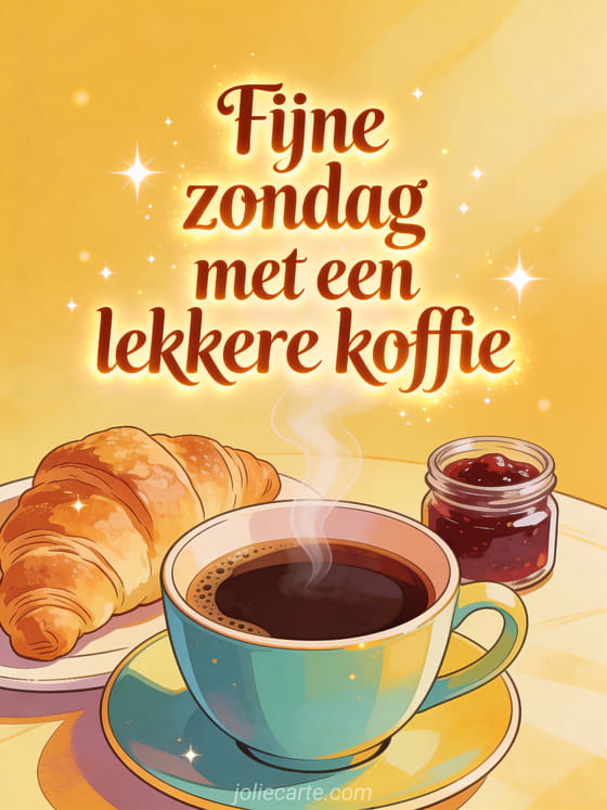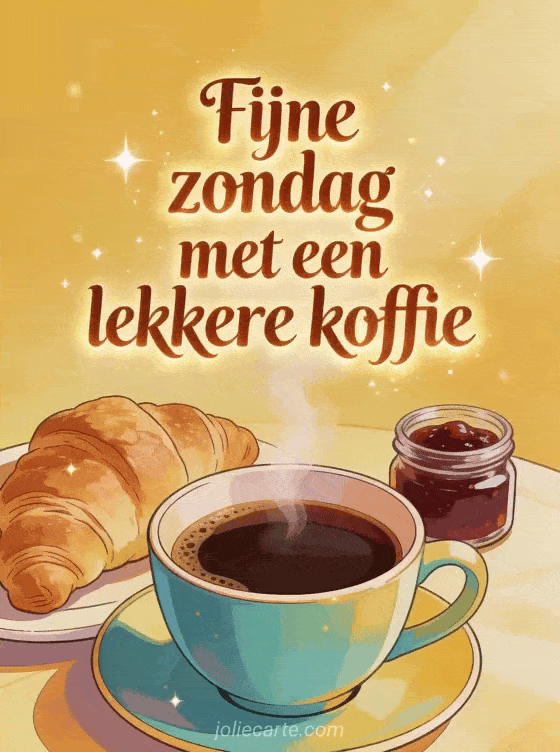 Stuur een warme zondaggroet met kastanjebruine letters, een dampende kop koffie, bladerdeeg, een klein potje jam, gouden ochtendtinten en fonkelende accenten. Bekijk ook deze fijne zondag mijn vriendin, deze fijne zondag grappige gif of deze mooie virtuele kaart fijne zondag.