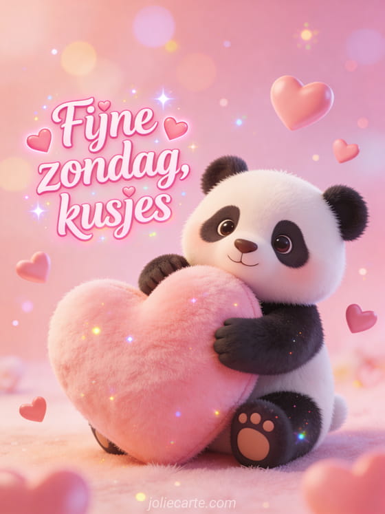 Deel een tedere zondaggroet met een schattige cartoonpanda die een grote hartknuffel omarmt, zwevende hartjes en zacht pastelroze licht. Je kunt ook bericht fijne zondag of een virtuele kaart hallo fijne zondag sturen.