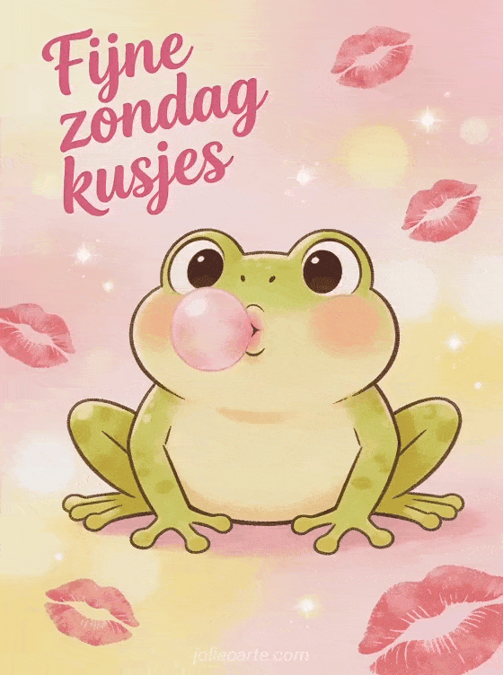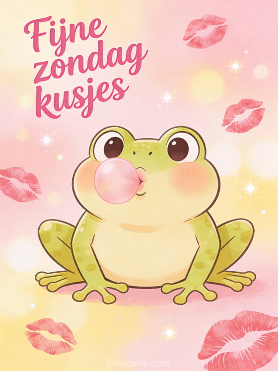 Deel een grappige fijne zondag groet met kusjes, speelse roze sierletters, lippenstiftkusjes en een grappige kikker die overdreven luchtkusjes blaast. Ontdek ook een kaart om een fijne zondag door te brengen, een kaart met hele fijne zondag kusjes of een geanimeerde gif voor fijne zondag.