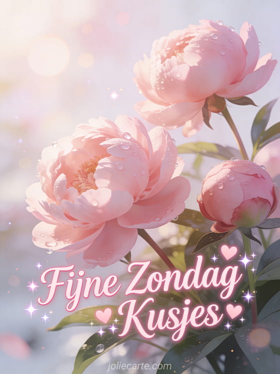 Stuur een romantische fijne zondag kusjes wens met delicate roze pioenen met dauwdruppels in een zachte ochtend.