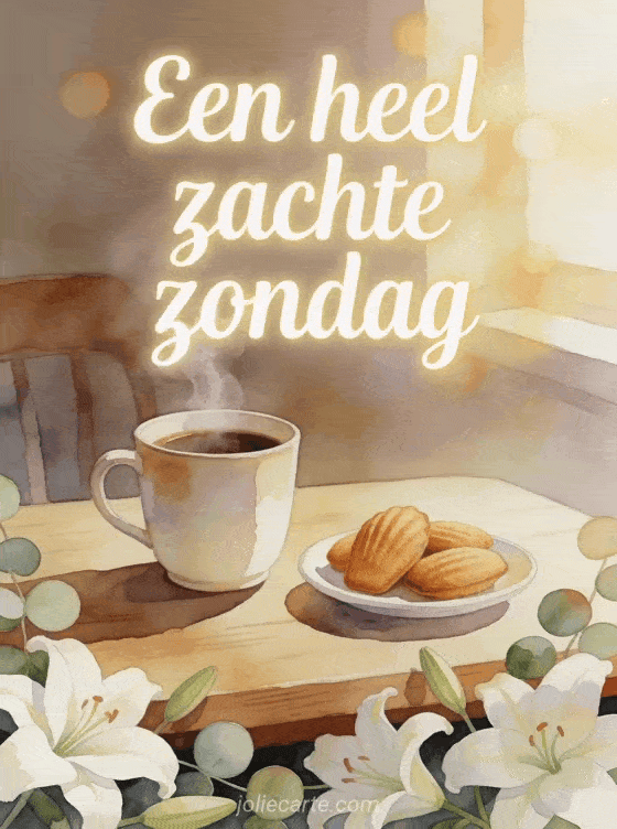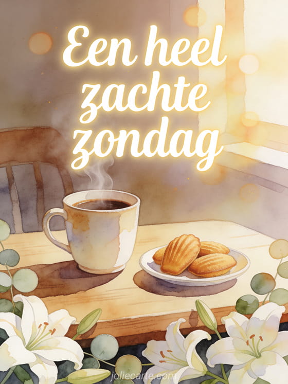 Deel een zachte kaart voor fijne zondag met een dampende koffiekop, madeleines en lelies op een houten tafel. Bekijk ook fijne zondag kat gif, gratis fijne zondag kaart of fijne zondag afbeeldingen.