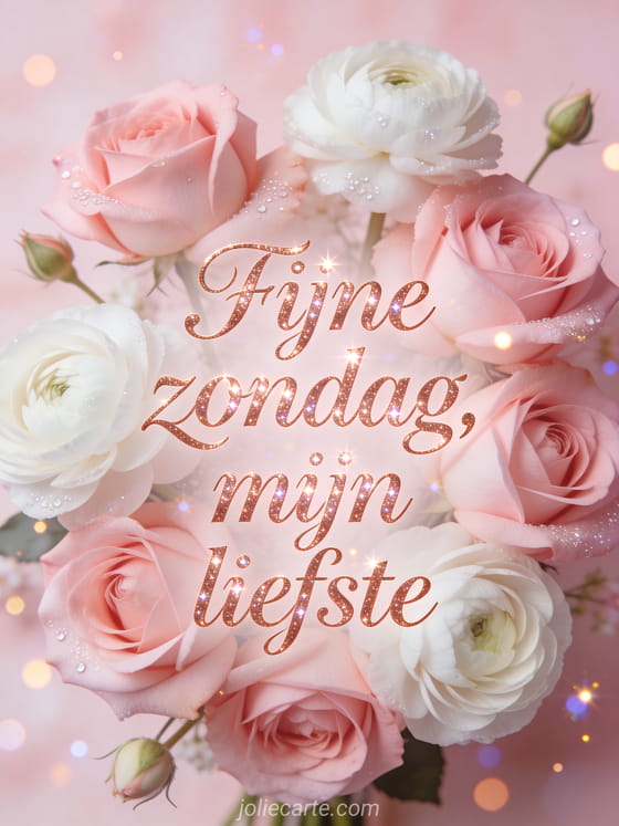 Deel fijne zondag mijn liefste met roségouden letters, een mooie schikking van roze rozen en witte ranonkels, fijne ochtenddauw en een elegante zachte roze sfeer. Ontdek ook goed einde van zondag of fijne dag zondag.