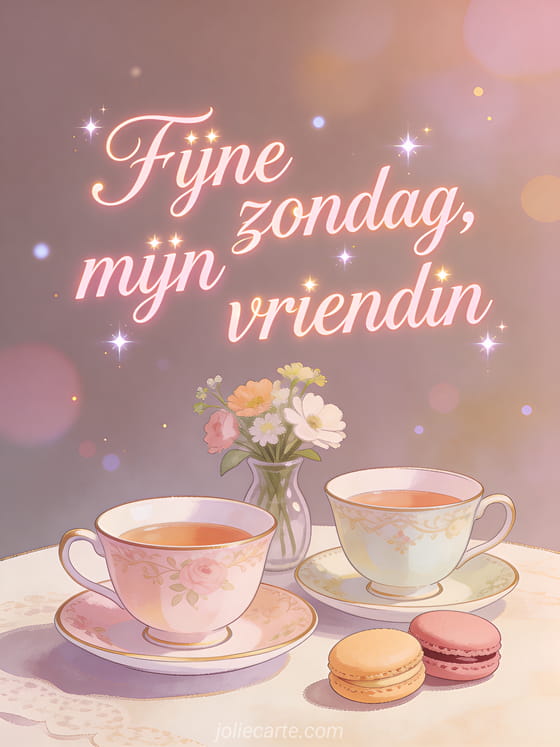 Deel fijne zondag mijn vriendin met warme roze letters, een elegante afternoon tea voor twee, mooie theekopjes, macarons, verse bloemen en een zachte vriendschapssfeer. Ontdek ook fijne zondag grappige gif of mooie virtuele kaart fijne zondag.