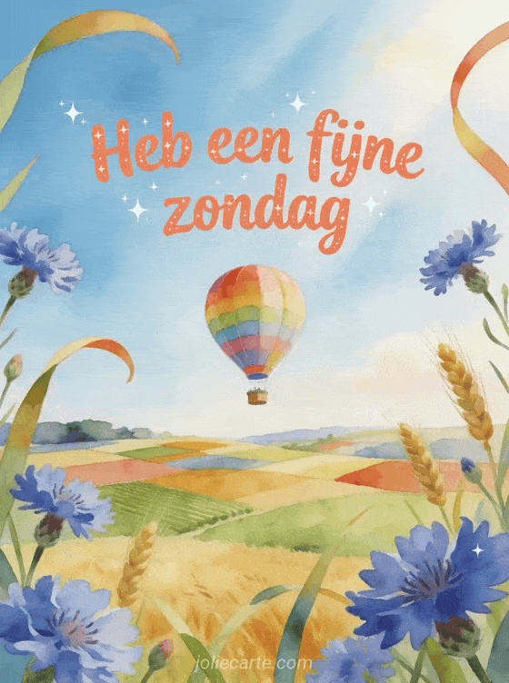 Deel een stralende groet voor fijne zondag met een kleurrijke luchtballon boven lappendekenvelden, korenbloemen en een zachte blauwe hemel. Bekijk ook mooie fijne zondag kaarten, fijne zondag wensen afbeelding of glinsterende fijne zondag gifs.