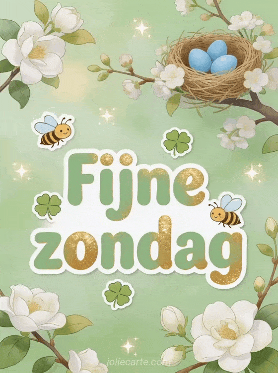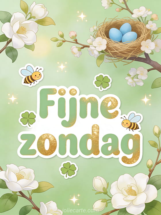 Deel een zachte kaart voor fijne zondag met saliegroene letters, gouden accenten, vrolijke bijen, geluksklavers en een gezellig vogelnest tussen geurige witte gardenia's. Je kunt ook een fijne zondag in de regen humor kaart, een klein bericht fijne zondag of een afbeelding om een fijne zondag te wensen sturen.