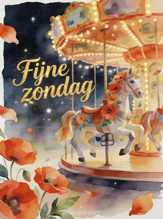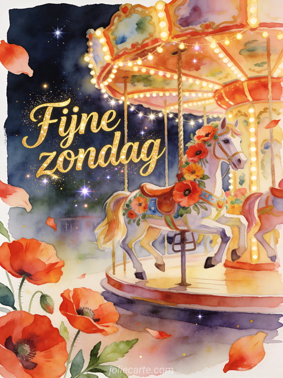 Deel een sprankelende fijne zondag met een carrouselpaard versierd met levendige klaprozen, lichtslingers en vrolijke aquarelbeweging. Ontdek ook een mooie tekst fijne zondag, een fijne zondag hart gif of goedemorgen zondag afbeeldingen.