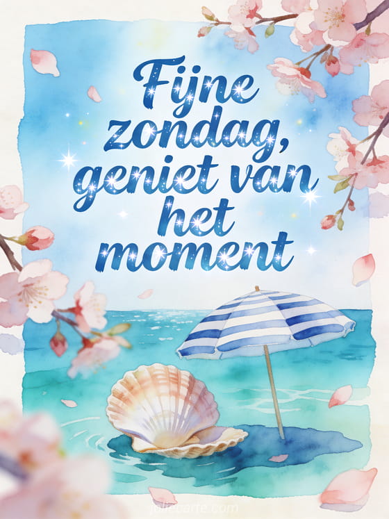 Stuur een vrolijke fijne zondag groet met een schelp, een gestreepte strandparasol, turquoise water en kersenbloesemblaadjes in kustlicht. Ontdek ook fijne zondag allemaal afbeeldingen, gratis zonnige fijne zondag afbeeldingen of een afbeelding fijne winterse zondag.