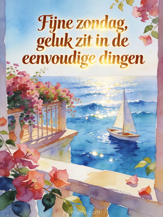 Deel een heldere zondaggedachte met kastanjekleurige tekst, een kleine zeilboot op blauw water, een terras bedekt met bougainville en zonlicht dat op de golven schittert. Bekijk ook een fijne zondag honden afbeelding, een fijne zondag geanimeerde virtuele kaart of een zondag kusjes gif.