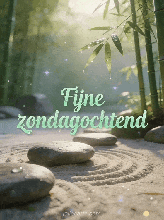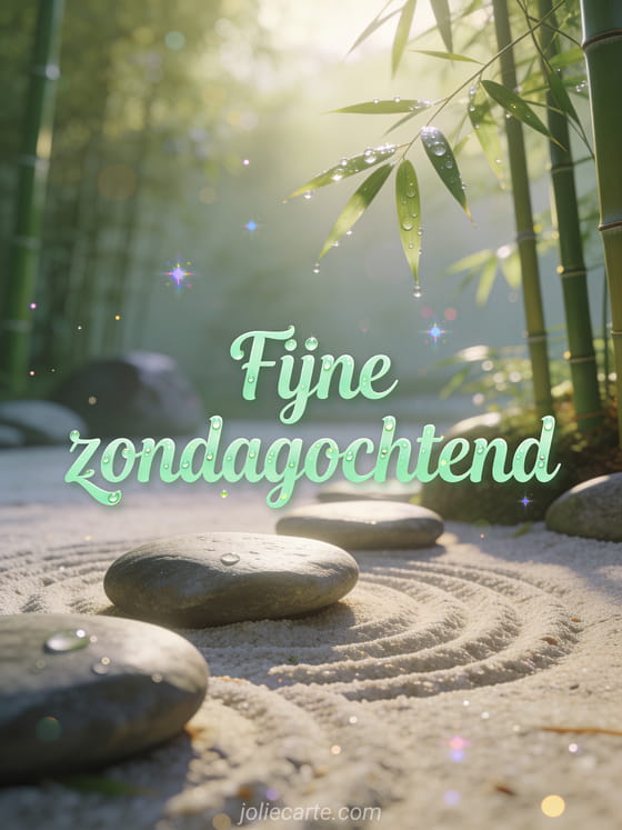 Stuur een vredige groet voor fijne zondagochtend met frisse mintgroene letters, dauwdruppel-effecten en een serene zen-tuin met gladde stenen en bamboe. Ontdek ook fijne zondag mijn liefste, goed einde van zondag of fijne dag zondag.
