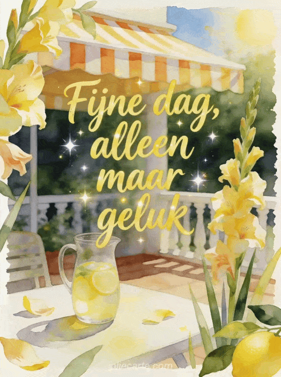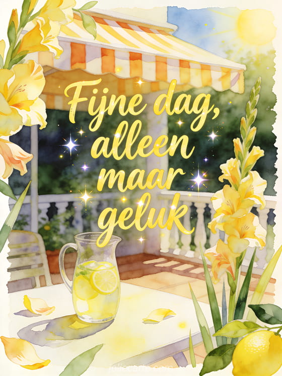 Wens een fijne dag vol geluk met een heldere aquarelterrasse, gestreepte luifel, kan limonade, gladiolen en zonnige lente-zomerwarmte. Ontdek ook een kaart met mooie goedemorgen fijne dag afbeeldingen, fijne dag en fijn weekend afbeeldingen of goedemorgen fijne dag kusjes gif.
