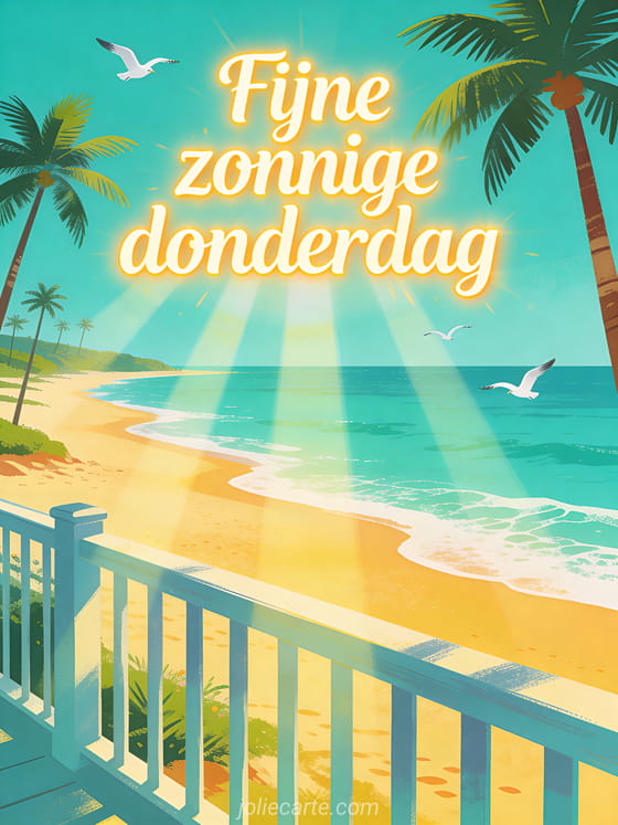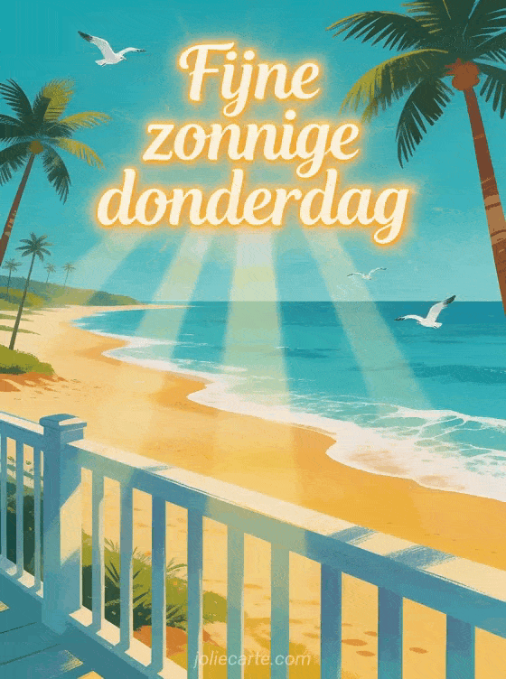 Deel fijne zonnige donderdag met stralende zomerletters, warme gloed, een levendige zonnige kust, sterke lichtstralen, heldere turkooistinten en vrolijke sfeer. Bekijk ook mooie afbeeldingen fijne donderdag kusjes, fijne donderdag hond afbeelding of fijne donderdag kat gif.