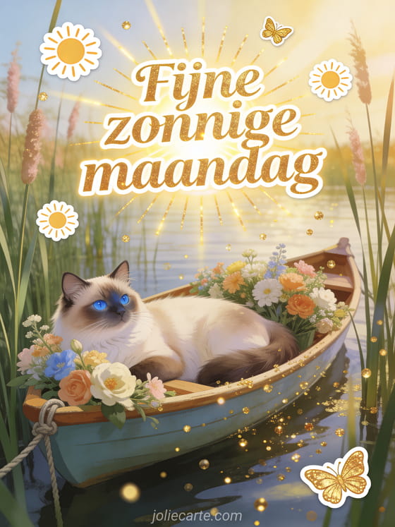 Stuur een kaart voor fijne zonnige maandag met stralende gouden letters, kleine zonnen, gouden vlinders en een met bloemen gevulde roeiboot in het riet, waar een blauwogige Heilige Birmaan kat tussen boeketten rust. Ontdek ook goedemorgen fijne maandag kusjes afbeelding, fijne zonnige maandag gif of maandag kusjes afbeeldingen.