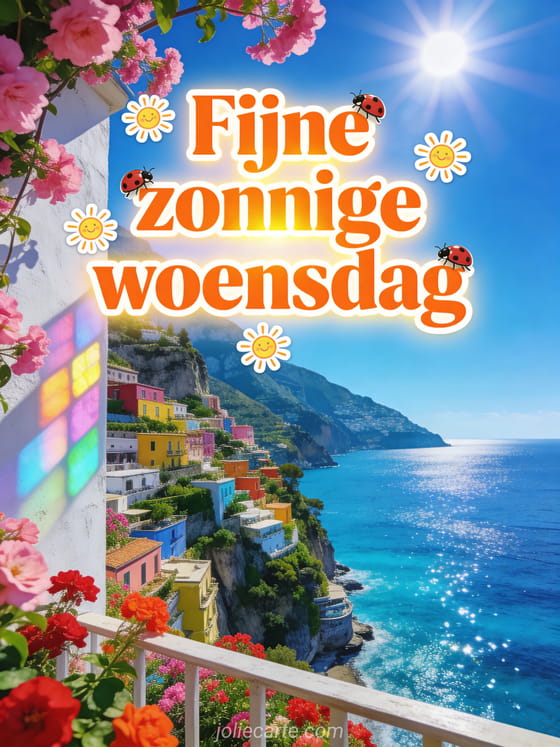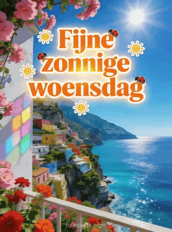 Verstuur een fijne zonnige woensdag gif met feloranje tekst, kleine zonnetjes, lieveheersbeestjes en de schitterende Amalfikust. Deel een vrolijke wens voor midden in de week en ontdek ook goedemorgen fijne woensdag geanimeerde gif, geanimeerde hond kus gif fijne woensdag of fijne woensdag tekst.