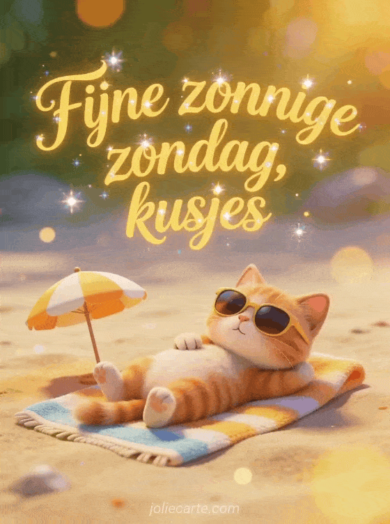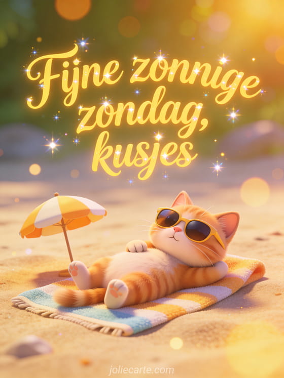 Deel een speelse zonnige zondaggroet met een schattig rood katje met zonnebril dat op een strandhanddoek ligt, een kleine parasol en zomerse sfeer. Je kunt ook fijne zonnige zondag afbeelding of fijne zondag kaart gif sturen.