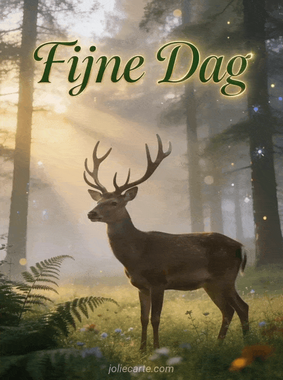 Stuur een prachtige fijne dag dinsdag foto via deze gratis wenskaart. Een majestueus hert staand in een mistig bosopen plek bij dageraad met lichtstralen die door hoge bomen filteren, varens en wilde bloemen op de voorgrond in een vredige natuurscène. Bekijk ook een centerblogs gif fijne dinsdag of een goedemorgen dinsdag koffie.