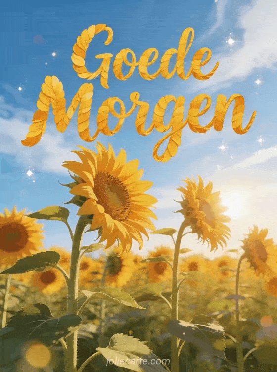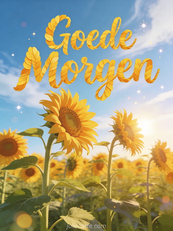 Stuur een lichtgevende foto goede morgen kaart met een veld hoge zonnebloemen die zich wenden naar de ochtendzon met een blauwe lucht vol sierlijke wolkjes in een vrolijke zomerse plattelandssfeer. Ontdek ook een bericht goede morgen kaart of een goede morgen citaat kaart of een goede morgen schat kaart.