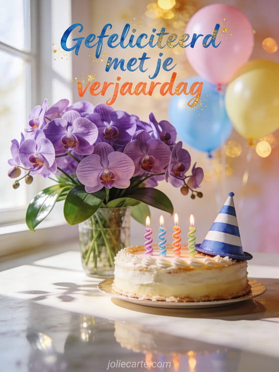 Verras een kind met deze vrolijke verjaardagskaart met een prachtig boeket paarse orchideeën en een feestmuts voor een taart. Ontdek ook een verjaardagskaart kinderfeest kind of een model tekst verjaardagskaart kind.