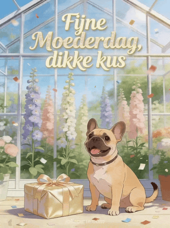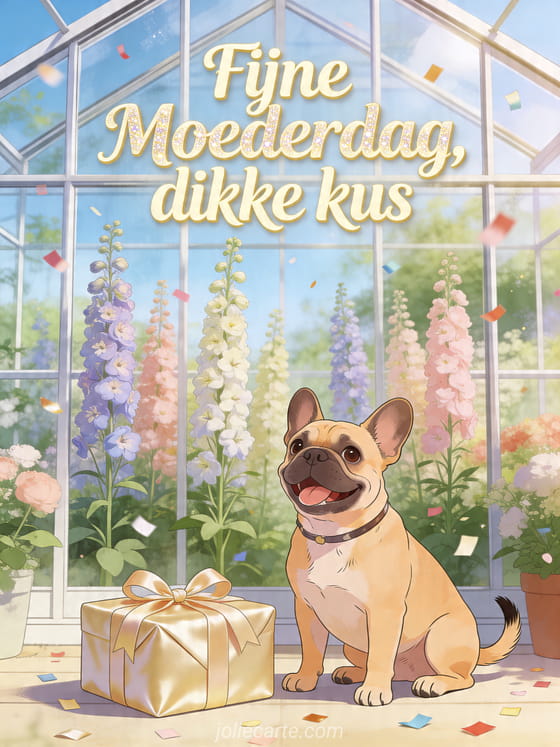 Deel een foto voor Moederdag met warme crèmekleurige letters, subtiele glitters en een heldere kas vol hoge ridderspoor. Een Franse buldog hond zit naast een satijnen cadeau en verspreide confetti in deze vrolijke kaart. Ontdek ook Moederdag rijmgedichten, woorden voor Moederdag of zoete woorden voor Moederdag.