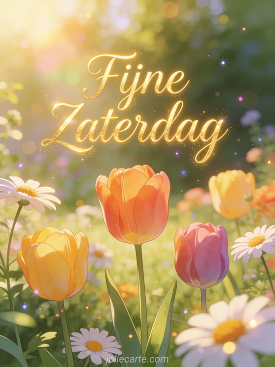 Deel een vrolijke zaterdagswens met deze mooie kaart met kleurrijke tulpen en madeliefjes in een lentetuin met ochtendlicht. Ontdek ook fijne zaterdag humor of een fijne zaterdag voor meer zaterdagsinspiratie.
