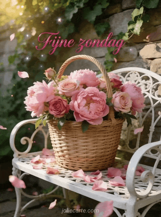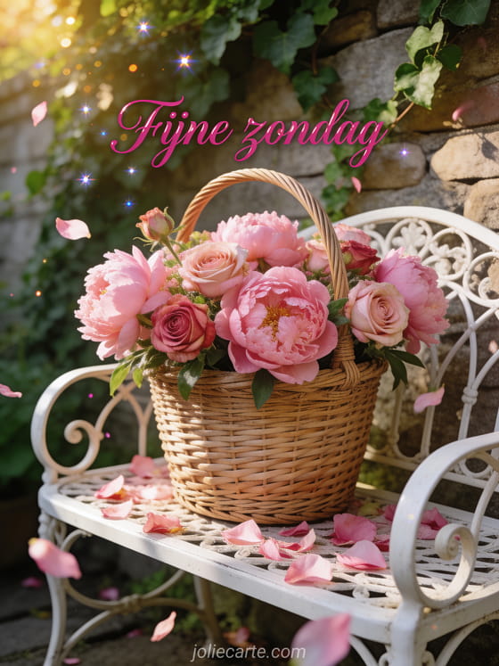 Wens een fijne zondag met deze romantische fotorealistische kaart met roze pioenrozen en antieke rozen in een rieten mand gebaad in gouden licht. Ontdek ook fijne zondag cocooning of goedemorgen zondag gif.