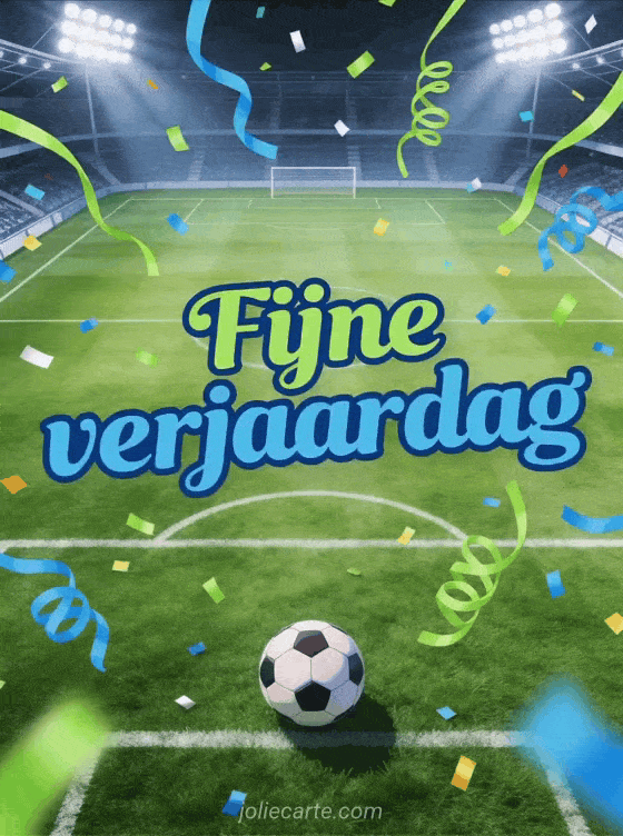 Vier een jongen met deze dynamische verjaardagskaart met een voetbalveld van bovenaf, een voetbal op het gras, confetti en felle stadionlichten. Bekijk ook geanimeerde verjaardagskaart 1 jaar, geanimeerde verjaardagskaarten jolie carte of geanimeerde verjaardag e-card.
