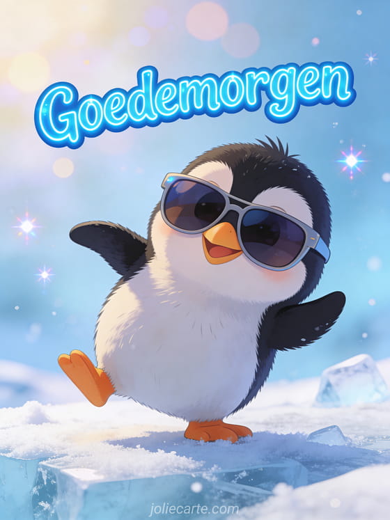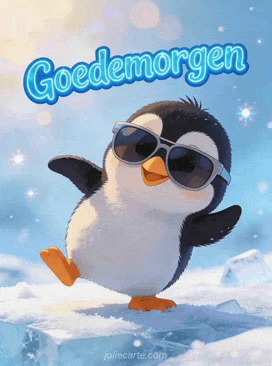 Stuur een hilarische geanimeerde goedemorgengroet met een gekke pinguïn met overdreven grote zonnebril die een coole pose aanneemt op een ijsachtige achtergrond. Bekijk ook een goedemorgen kusjes of een gratis goedemorgen afbeeldingen.