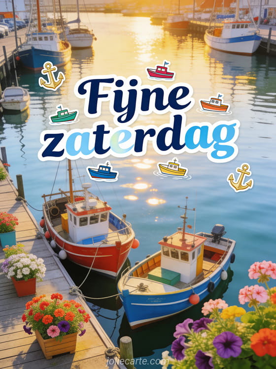 Deel een vrolijke kaart voor fijne zaterdag met marineblauwe letters, witte accenten, stickers van kleurrijke boten en gouden ankers, een bloemrijke kade, aangemeerde vissersboten en plantenbakken vol geraniums en petunia's. Bekijk ook fijne zaterdag allemaal gif, fijne lentezaterdag of deze afbeelding voor fijne zaterdag.