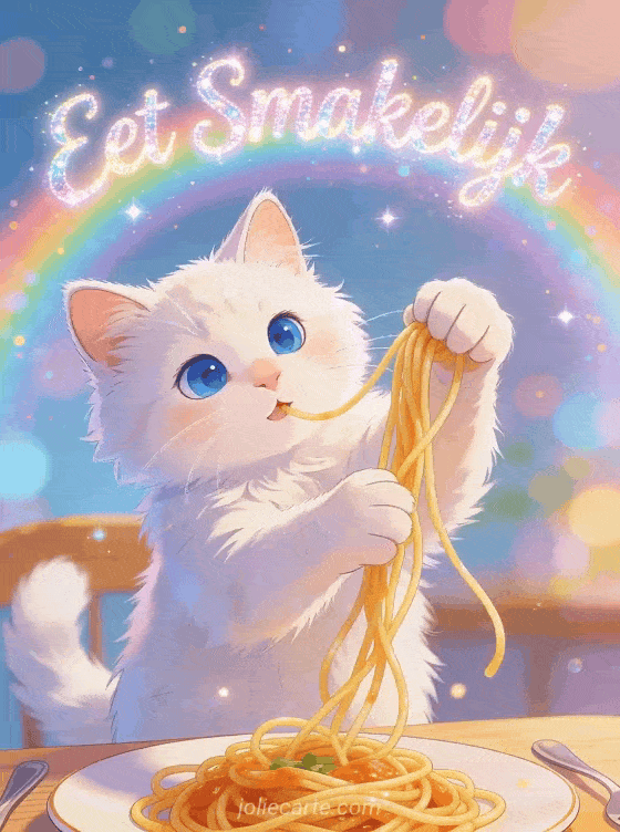 Deel een kleurrijke geanimeerde eet smakelijk afbeelding met deze schattige kattenkaart. Ontdek ook een kaart gif fee eet smakelijk of een kaart afbeeldingen eet smakelijk humor.