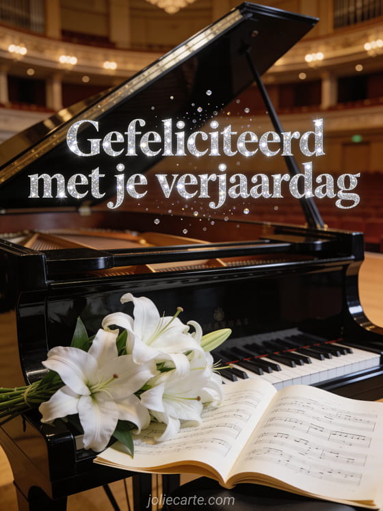 Verbluft hem op zijn verjaardag met deze muzikale kaart. Een glanzende zwarte vleugel met open deksel, witte lelies en open partituren in het zachte spotlicht van een concertzaal — elegant en indrukwekkend. Ontdek ook een gif van harte gefeliciteerd man humor of een mooie verjaardagskaart man gratis geanimeerd.
