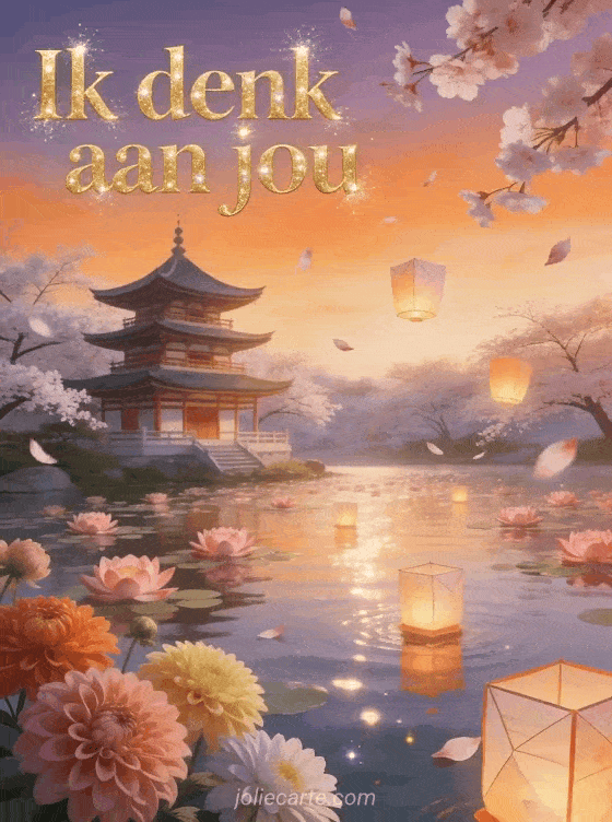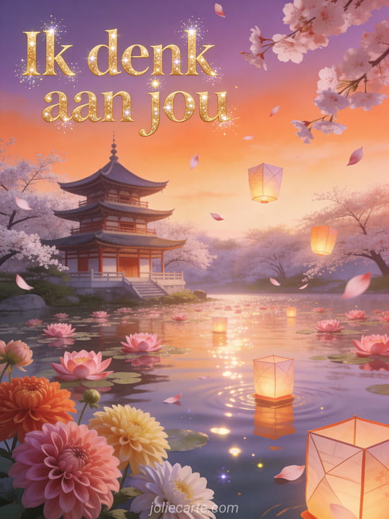 Stuur een magische kaart met een Japanse pagode aan een meer vol roze lotussen bij schemering met kersenbloesem en kleurrijke dahlia's om iemand te laten weten dat je aan hem denkt. Bekijk ook een geanimeerde gif ik denk aan jou, kaarten ik denk aan jou of kaarten ik denk aan jou.