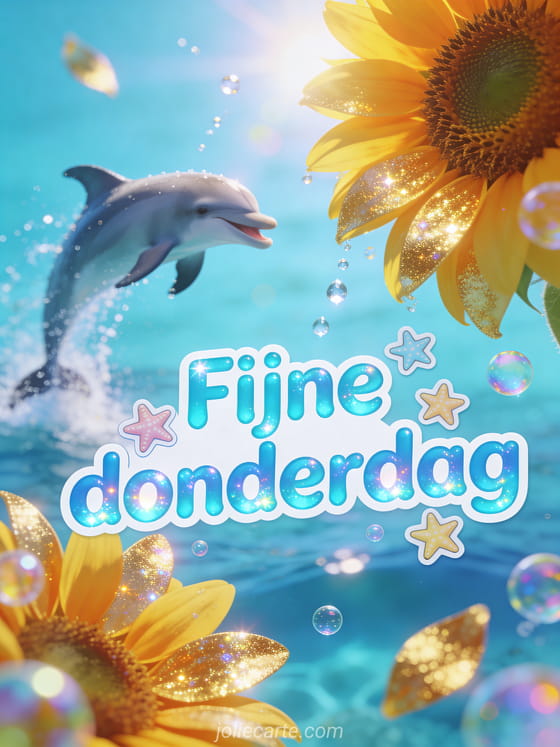 Stuur een vrolijke donderdaggroet met levendige turquoise letters, zeesterren, iriserende bellen, heldere zonnebloemen op de voorgrond en een dolfijn die uit het water springt in intens zonlicht. Bekijk ook deze fijne donderdag kusjes, deze goedemorgen fijne donderdag kaart of deze gratis fijne donderdag kaart.
