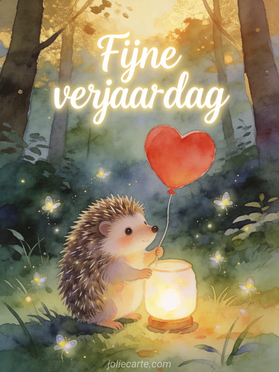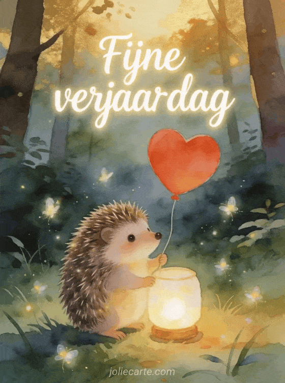 Stuur een schattige geanimeerde fijne verjaardag kaart met een egel met een rood hartballon in een betoverde open plek in het bos. Bekijk ook een geanimeerde verjaardagskaart of een geanimeerde verjaardagskaart hond.