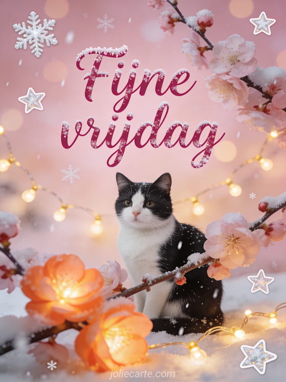 Verstuur een geanimeerde fijne vrijdag kaart met donkerroze sierletters, ijzige sneeuwvlokken, kersenbloesem en een zwart-witte tuxedo kat tussen de takken. Deel een gezellige wens voor het einde van de week en ontdek ook fijne vrijdag allemaal gif, grappige fijne vrijdag humor of fijne vrijdag bloemen afbeeldingen.