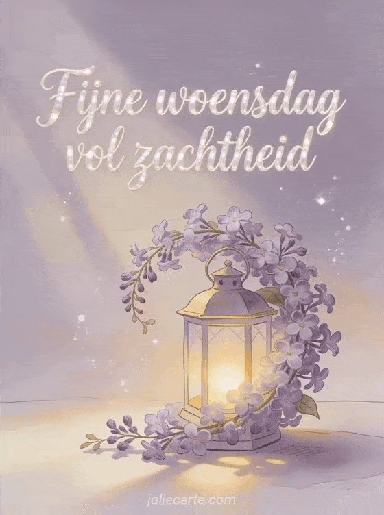 Deel een zachte woensdaggroet met vloeiende kalligrafie, parelmoerglans, seringtakken naast een kleine lantaarn, warme ochtendstralen en luchtige schittering. Bekijk ook hoi fijne woensdag humor, goedemorgen het is woensdag gif of geanimeerde fijne woensdag.