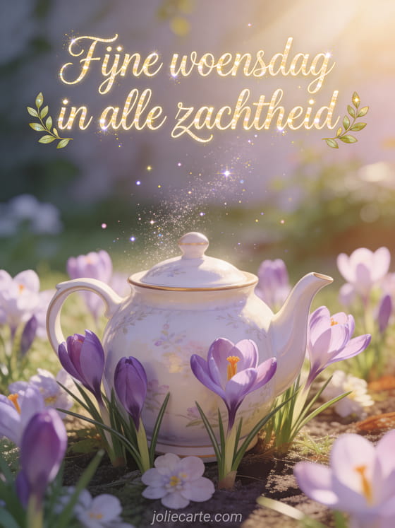 Deel een zachte woensdaggroet met luchtige letters, subtiele glans, krokusbloemen rond een porseleinen theepot, glinsterend stof en rustig lentelicht. Bekijk ook goedemorgen mijn mooie woensdag, goedemorgen het is woensdag of goedemorgen fijne woensdag afbeelding.