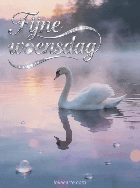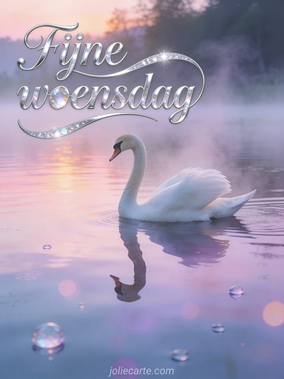 Stuur een elegante woensdaggroet met een witte zwaan die bij dageraad over een spiegelend meer glijdt, omringd door zachte nevel en pastel weerspiegelingen. Ontdek ook fijne woensdag berg, geanimeerde fijne woensdag afbeeldingen of goedemorgen mijn mooie woensdag.