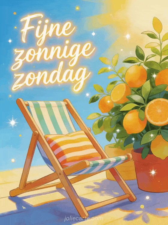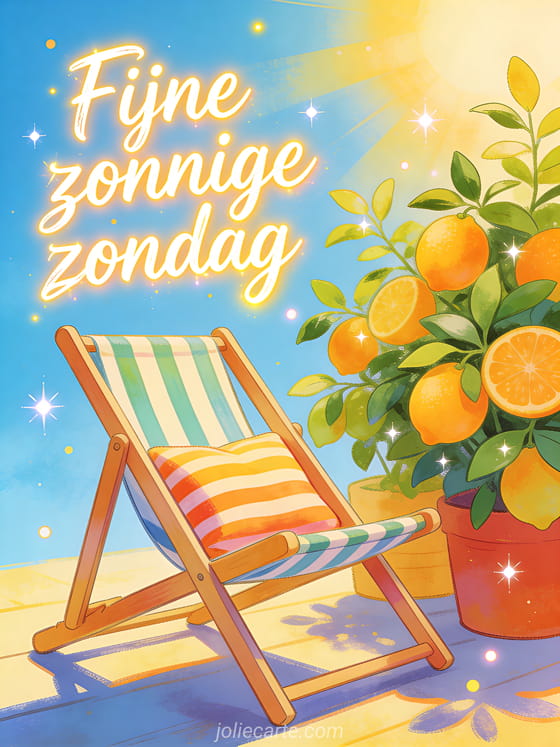 Stuur fijne zonnige zondag met een ligstoel naast heldere citrusplanten en gestreepte kussens onder een stralende lucht. Bekijk ook fijne zondag rust, fijne zondag kusjes gif of bericht fijne zondag.