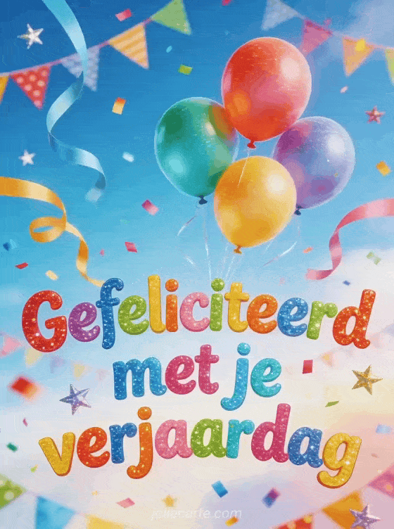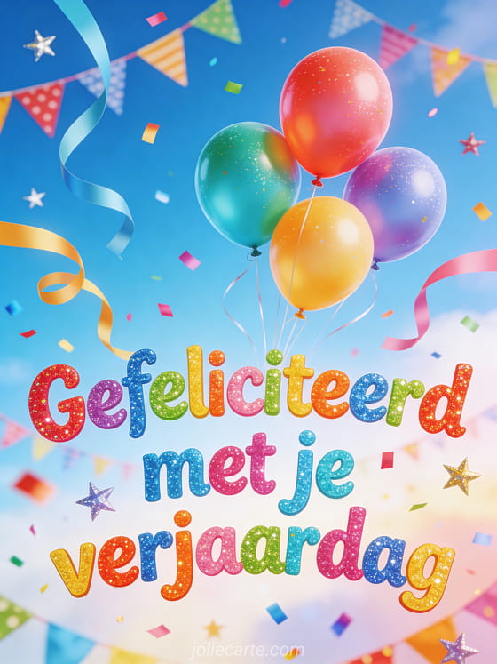 Deel een heldere verjaardagsgroet met veelkleurige glitterletters, kleurrijke ballonnen die opstijgen in een blauwe lucht, golvende linten, vallende confetti, feestelijke vlaggetjesslingers en sterren. Stuur ook een gefeliciteerd met je verjaardag mama kaart, een gefeliciteerd met je verjaardag kaart voor een jonge mama of gefeliciteerd met je verjaardag mama afbeeldingen.