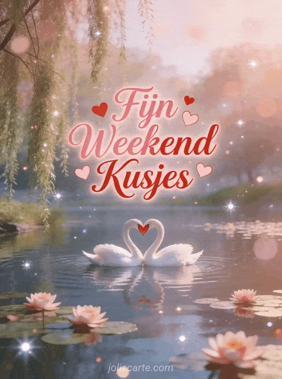 Deel een tedere geanimeerde groet met twee zwanen die een hart vormen tussen waterlelies. Ontdek ook een fijn weekend afbeeldingen kaart of een fijn weekend allemaal kaart.