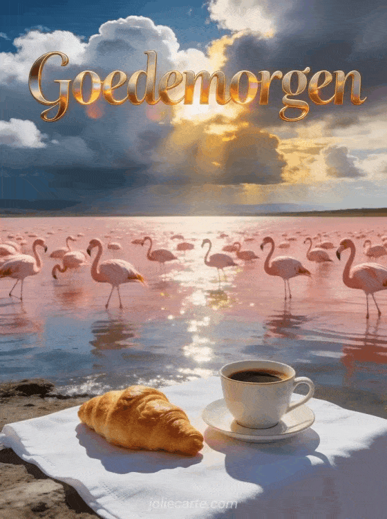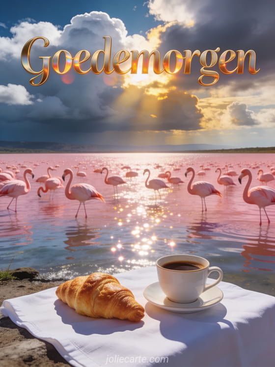 Geanimeerde gif goedemorgen koffie croissant een verrassend en kleurrijk goedemorgen bericht met koffie, croissant en flamingo's