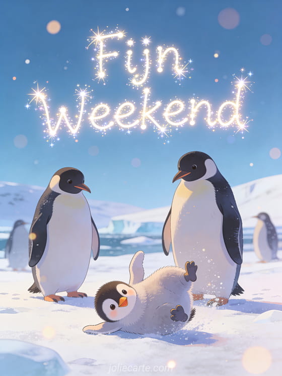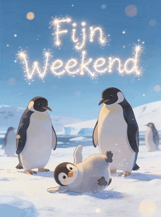 Wens iemand een fijn weekend met deze grappige geanimeerde kaart met een onhandige babypinguïn. Ontdek ook een kaart fijn weekend of fijn regenachtig weekend humor.