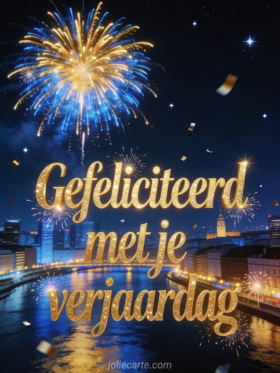 Verras een man met deze spectaculaire verjaardagskaart met gouden en blauwe vuurpijlen boven een verlichte stad. Ontdek ook een gif verjaardagskaart man of een mooie gratis verjaardagskaart man.