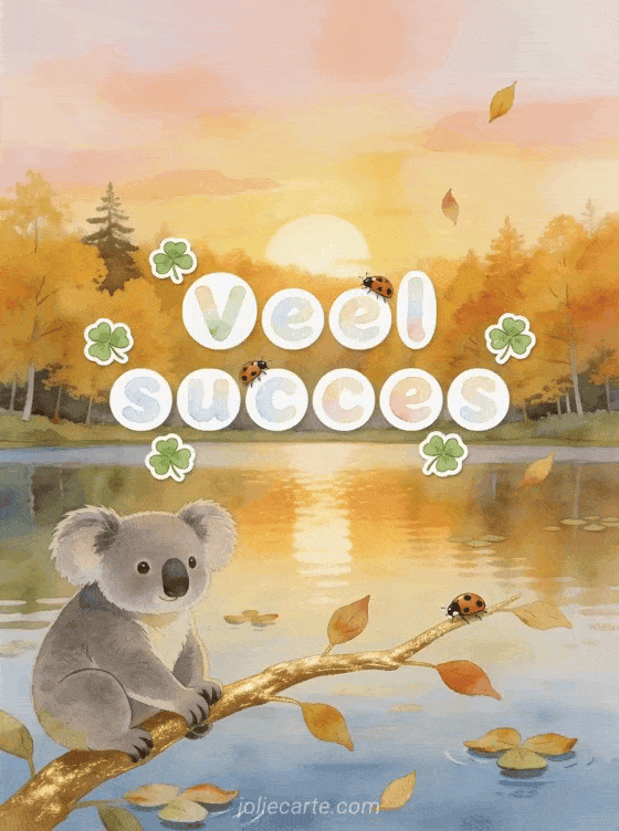 Stuur een warme geanimeerde veel succes kaart met een koala op een gouden herfsttak naast een meer. Bekijk ook een bericht veel succes wedstrijd of een hoe wens je iemand veel succes.