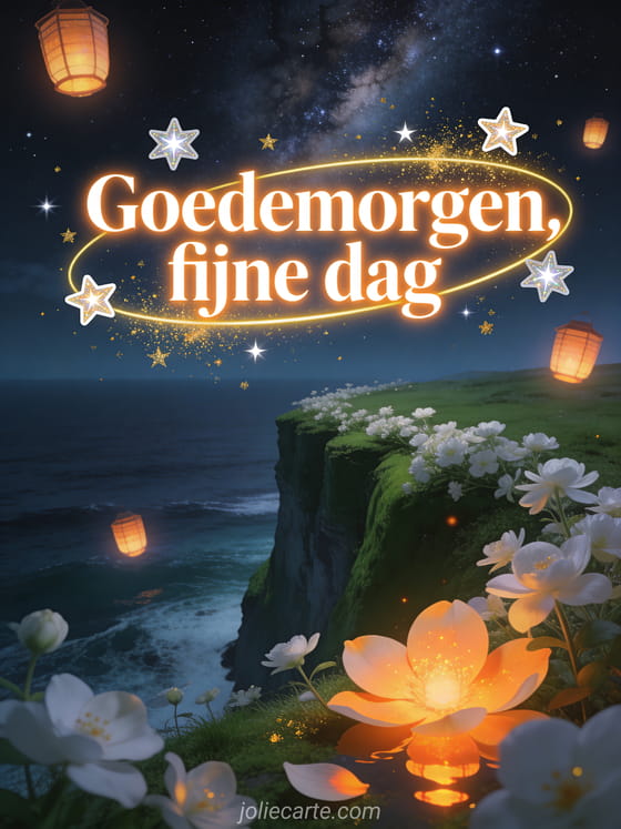 Verras iemand met deze dromerige fijne dag kaart met witte bloemen op een klif boven de oceaan onder een sterrennacht met drijvende lantaarns. Ontdek ook een virtuele kaarten fijne dag goedemorgen of een kaart goedemorgen en fijne dag.