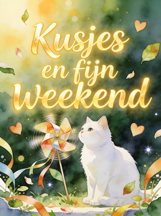 Deel een speelse weekendgroet met een witte kat naast een draaiend pinwheel, zwevende hartvormige bladeren en een zonnige tuin in aquarel. Je kunt ook fijn weekend dikke kus, fijn weekend met kusjes of kusjes weekend sturen.