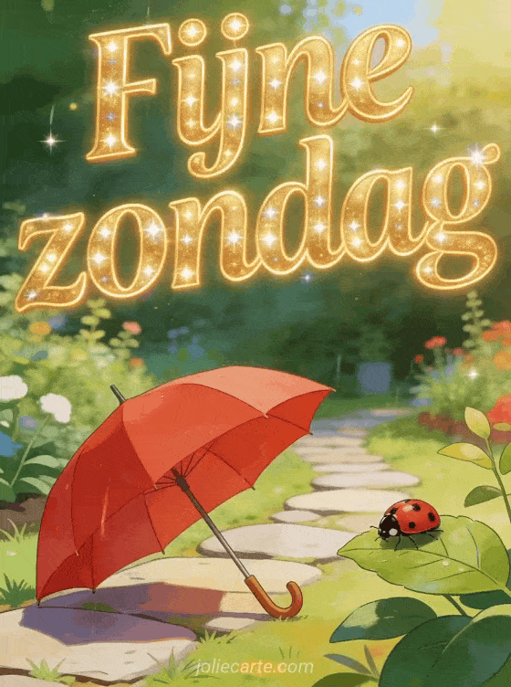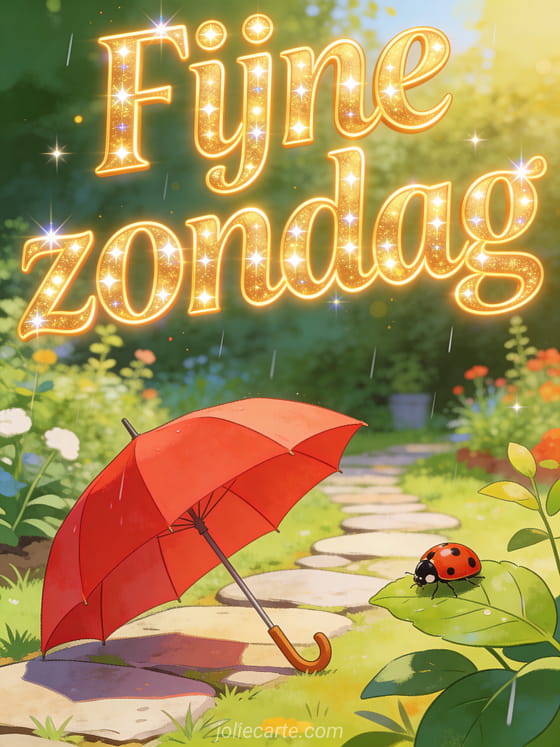 Stuur een vrolijke fijne zondag-groet met een rode paraplu op een stenen tuinpad en een klein lieveheersbeestje op een blad. Bekijk ook humoristische fijne zondag humor dieren, een fijne zondag gratis geanimeerde virtuele kaart of fijne zondag kusjes humor.