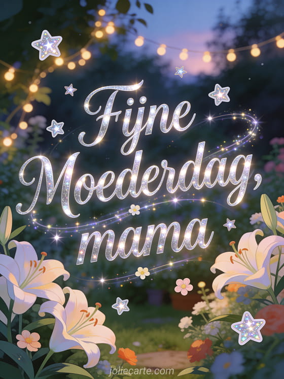 Verras mama met deze prachtige geanimeerde moederdagkaart met glinsterende zilveren tekst en lelies onder sprookjesverlichting. Ontdek ook een moederdag afbeelding of een mooie moederdagkaart.
